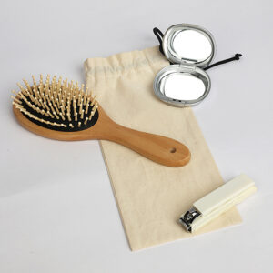 Ce set manucure comporte une lime, un coupe-ongles, un repousse-cuticules, une pince à épiler, des ciseaux.. le tout est disposé dans une élégante pochette personnalisable.